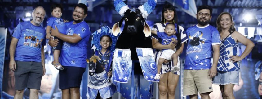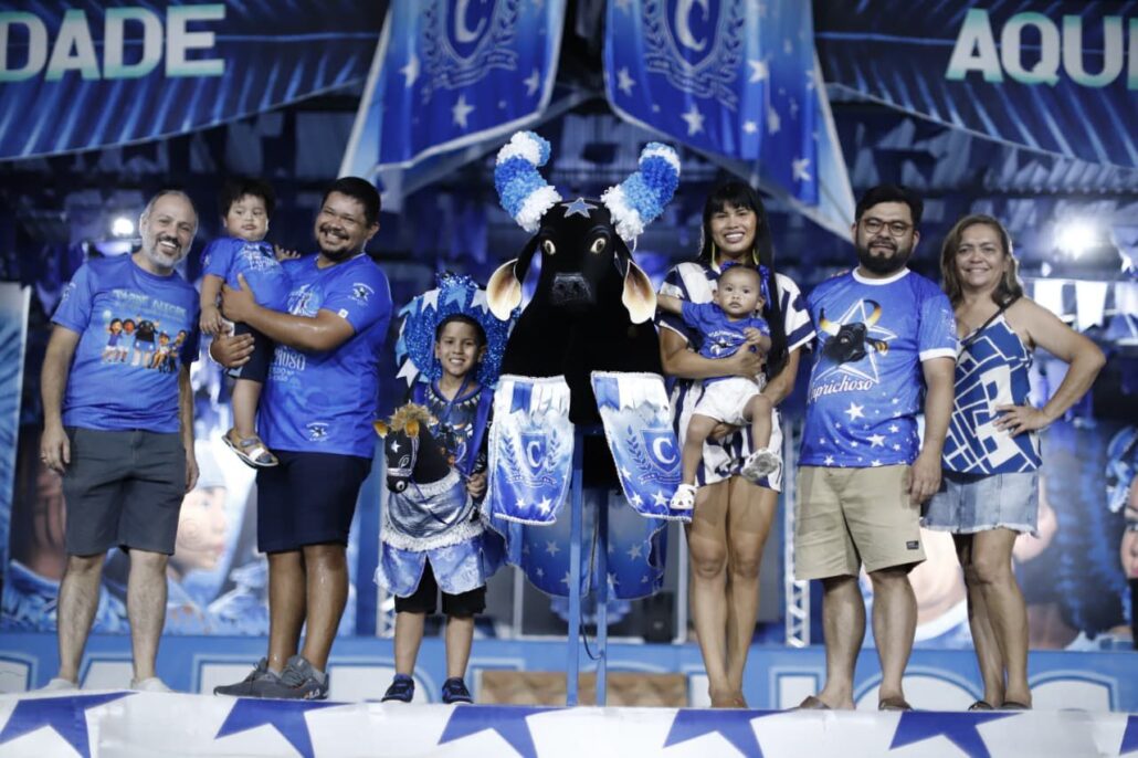 Durante a festa, o Caprichoso prestou homenagem às crianças que estampam a capa do tema 2026, “Caprichoso, brinquedo que canta este chão”. No palco, o presidente do Conselho de Arte, Ericky Nakanome, apresentou os pequenos Miguel Souza, Iraê Beltrão, acompanhada da mãe, Ira Maragua, e João Mateus, representantes da nova geração do boi azul.